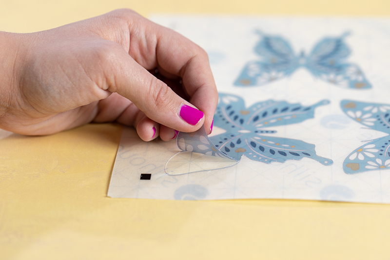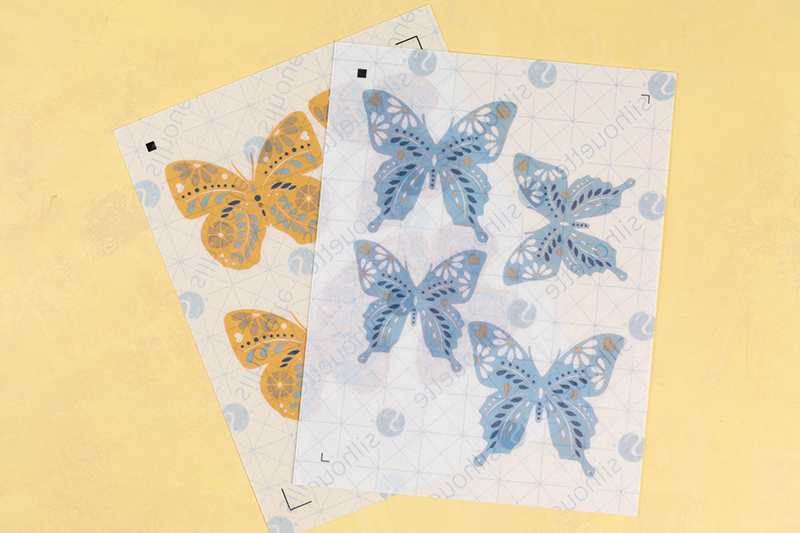 Zorg ervoor dat je je registratiemarkeringen aanzet! Dit toont je de print- en snijranden, zodat je weet hoeveel ruimte je hebt om mee te werken. We konden vier van elke vlinder op elke pagina kwijt. Het is altijd een goed idee om je pagina te vullen, zelfs als je niet verwacht alle stukken te gebruiken. Dit minimaliseert verspilling en je houdt een paar extra vlinders over voor het geval je ze nodig hebt. We moesten twee van de lichtblauwe vlinders verkleinen en ze iets kleiner maken, zodat ze op onze pagina zouden passen. Maar toen de stukken eenmaal waren gekrompen, zag je nauwelijks het verschil.