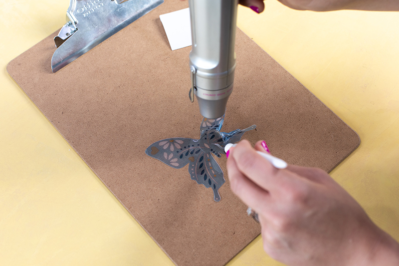 We wilden een beetje dimensie toevoegen aan onze vlinders. We houden van de look van een rustende vlinder en hoe hun vleugels lichtjes opgetild zijn. Wanneer het plastic nog een beetje warm en buigzaam is, gebruik je je schraper en spatel om een vleugel van het oppervlak te tillen. Je kunt dit doen met een heteluchtpistool of een oven om je stukken te laten krimpen. Deze stap is optioneel, maar het voegt een mooi detail toe aan het voltooide bord.