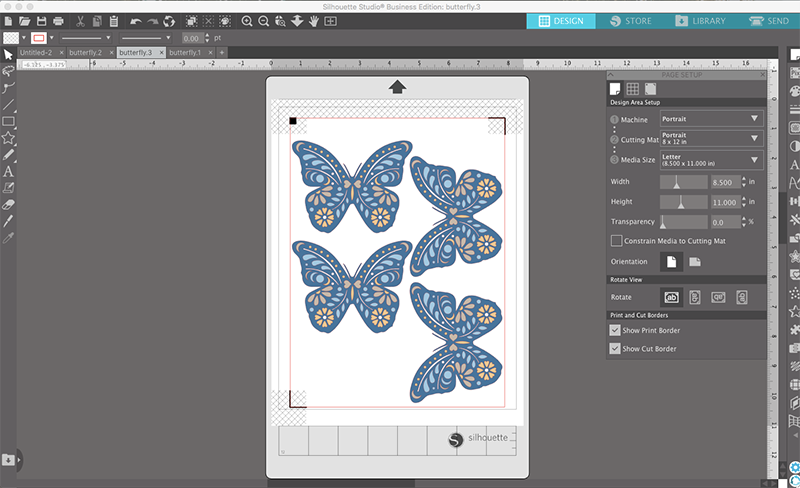 Nadat u de ontwerpen in de Silhouette Design Store hebt gekocht, opent u drie nieuwe documenten in Silhouette Studio. De reden dat u drie afzonderlijke bestanden wilt maken, is zodat u de vlinders niet hoeft te verplaatsen nadat u ze hebt afgedrukt. Dit zorgt voor een perfecte snit! Open de bestanden door naar uw bibliotheek te gaan en dubbel te klikken op elke vlinder. Dit plaatst het bestand in het document.